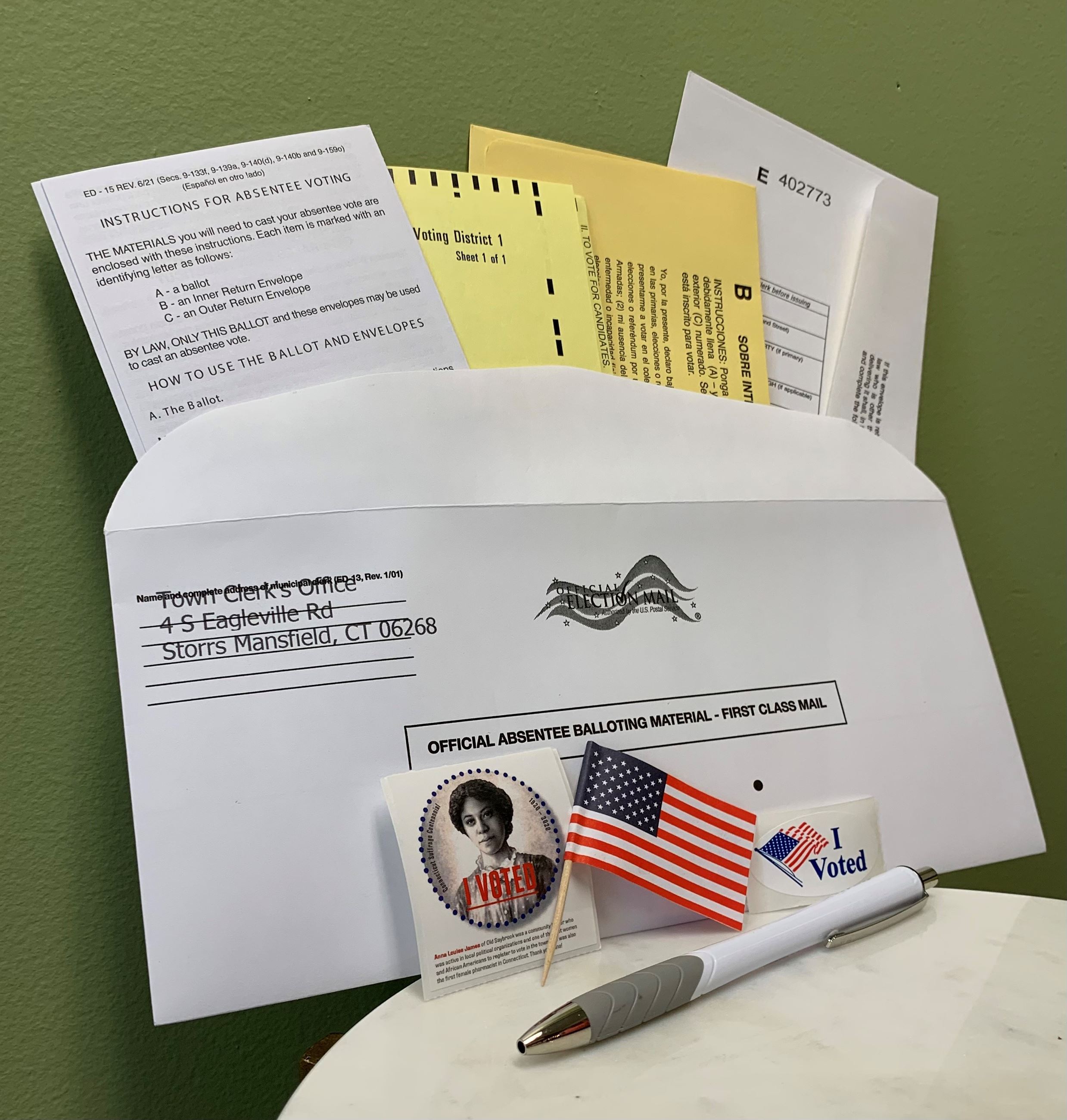In Connecticut, voters must apply to vote by absentee ballot. Download (see link above) or request an application by calling 860-429-3302 ext. 4 or emailing your request with mailing address to TownClerk@mansfieldct.org. Return your completed application with original ink signature 1) by mail to: Town Clerk, 4 South Eagleville Road, Mansfield, CT 06268, 2) to the Town's 24/7 access general drop box (located to the left of the Town Hall door closest to the offices of the Tax Collector and Town Clerk, RT 275 side of the building), or 3) to the Office of the Town Clerk.