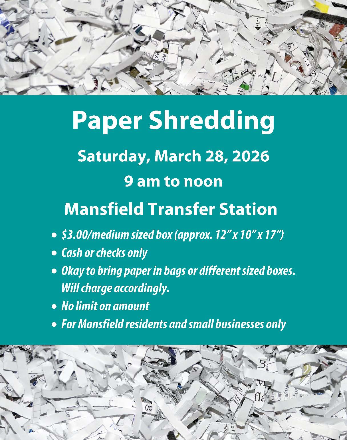 Bring your sensitive documents to the Transfer Station on Saturday, March 28, 2026 from 9 am to 12 pm. Documents will be shredded on site. The charge is $3.00 for a medium-sized box (12” x 10” x 17”) but it is fine to bring paper in bags or different sized boxes. We will charge accordingly. Please bring cash or checks. There is no limit on quantity.